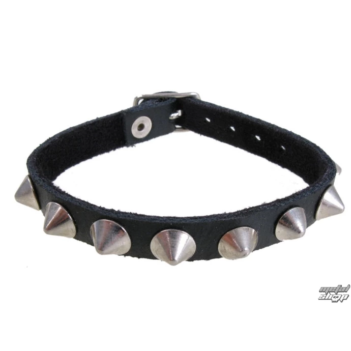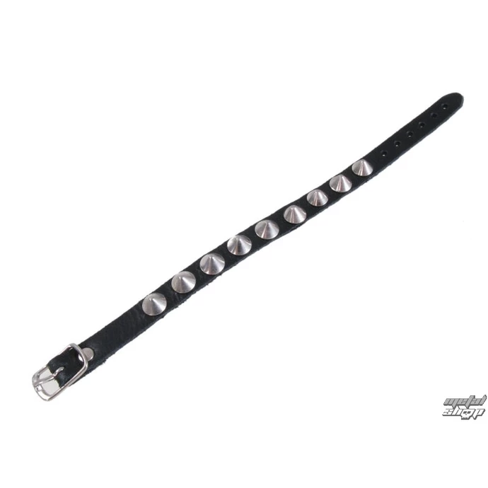 1 row cone bracelet with buckle fastening – 7 positions. Composition- technical leather, metal cones silver colour. Height of cones approx. 0,5 cm. Bracelet width: 1cm. For wrist circumference approx. 14-19,5cm.