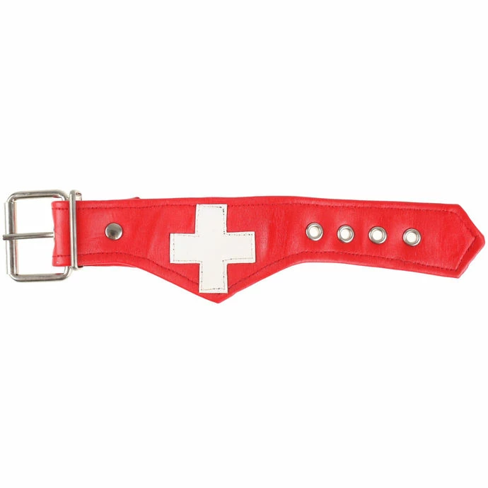 Stylish red bracelet with white cross. Composition: synthetic leather (PU)Approximate dimensions:Total length: 25 centimetersMaximum wrist circumference: 21 centimetersTotal width: 5 centimeters