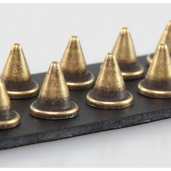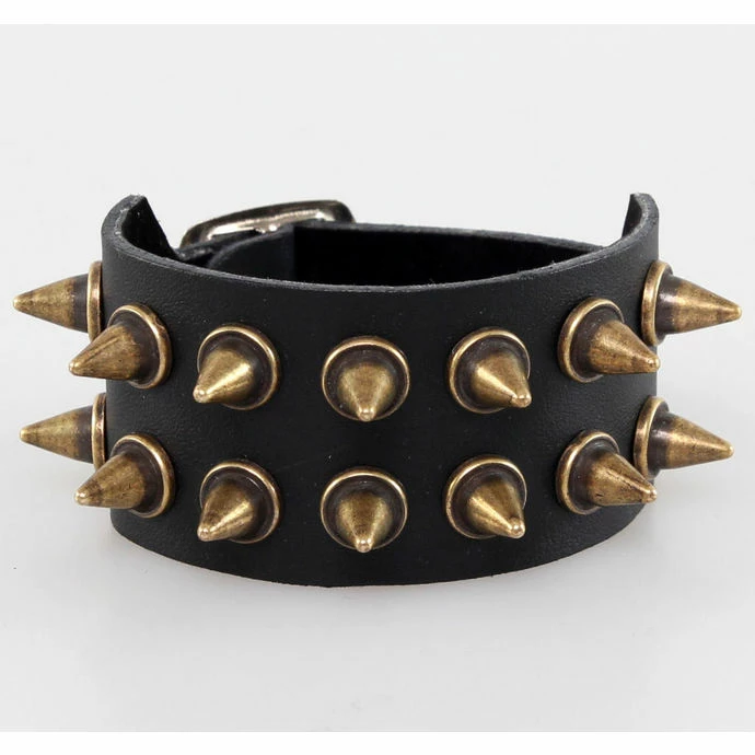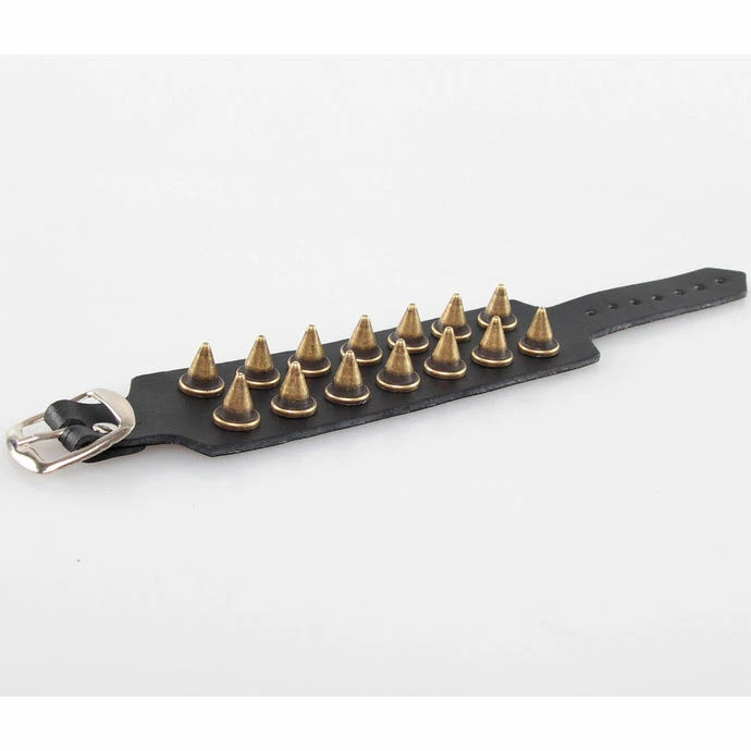 2x Series bracelet with spikes. Color: black spikes have brass color. Composition: synthetic leather, metal spikes. For wrist approx .: 16-22,5cm. The total length of the bracelet approx .: 24.5 cm. The height of the cone of approx .: 1.3 cm. The width of the cone at the bottom of approx .: 1.1 cm. The width of the bracelet approx .: 4.1 cm. Number of cones: 14kusů.
