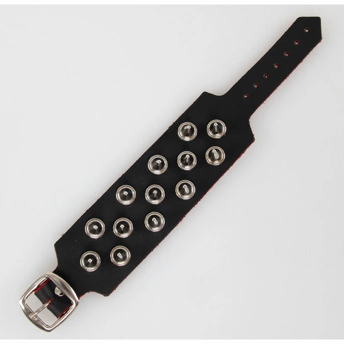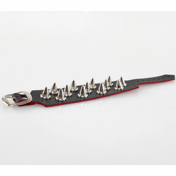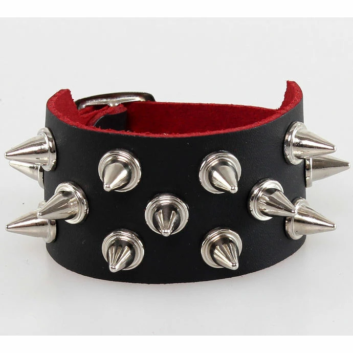 3x Series bracelet with spikes. Color: black, the lower part is red. Composition: synthetic leather, metallic silver spikes. For wrist approx .: 15-22 cm. The total length of the bracelet approx .: 24 cm. The height of the cone of approx .: 1.3 cm. The width of the cone at the bottom of approx .: 1.1 cm. The width of the bracelet approx .: 4 cm. Number of cones: 13kusů.