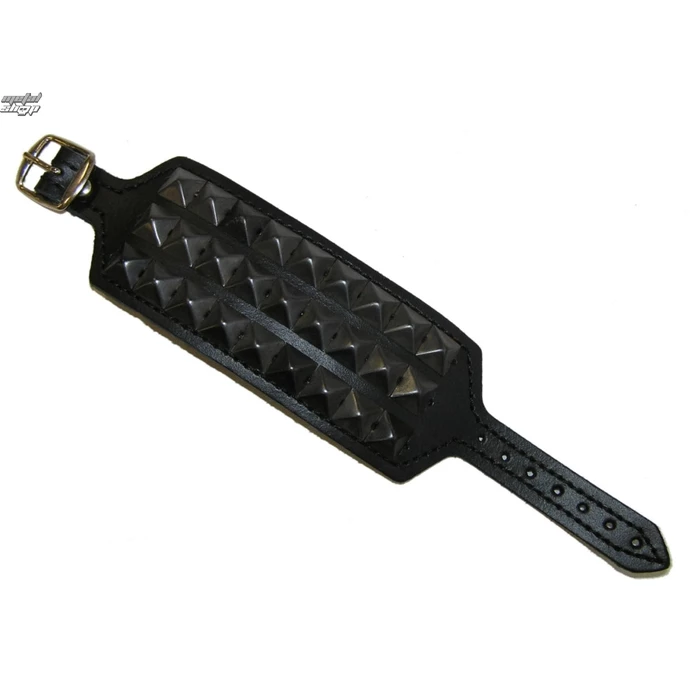 3 rows pyramid bracelet with clasp fastening – 7 positions. Composition – technical leather, black metal pyramids. Height of pyramids approx. 1 cm. Width of the bracelet: 5,2cm. For wrist circumference approx. 16-22cm.